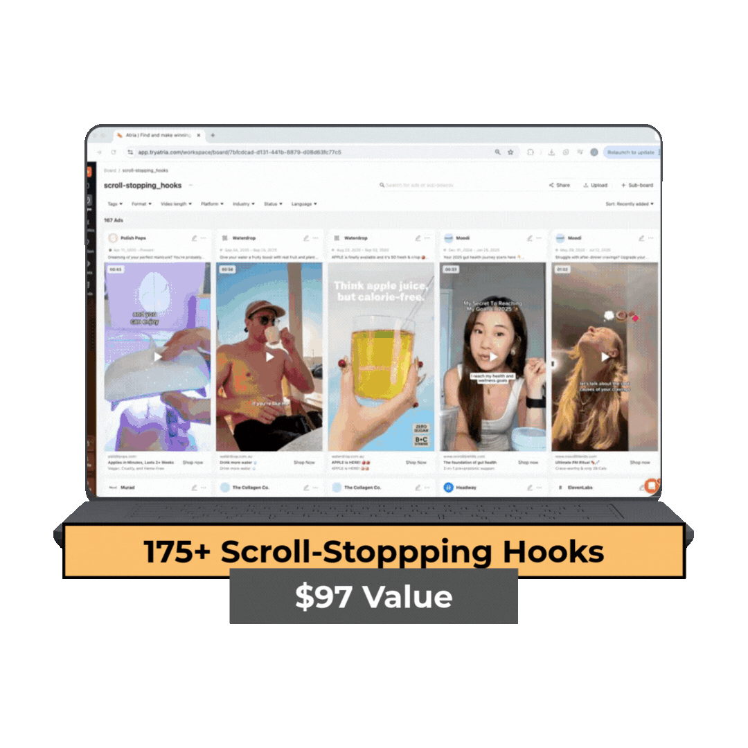 175+ scroll-stopping hooks. Use this swipe file to speed up your creative process with high-performing ideas across dozens of industries.